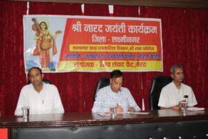 बान की मून का उदाहरण देते हुए कहा कि एक इंटरव्यू में उन्होंने कहा था कि विश्व संरक्षण का एकमात्र उपाय भारतीय संस्कृति ही है जो एकात्म मानववाद को प्रेषित कर सकती है। अध्यक्ष प्रोफेसर एस सी कुलश्रेष्ठ ने सभी विषयों को समावेशित करते हुए नारद जी के पद चिन्हों पर चलने का आवाहन करने को कहा। उन्होंने सरकार के द्वारा पत्रकारों को आर्थिक योजना संबंधित विषय रखने को भी कहा। श्री राम कॉलेज प्रधानाचार्य श्रीमती प्रेरणा मित्तल एवं पत्रकारिता विभाग अध्यक्ष रवि गौतम,मयंक,शिवानी,कहकशा रहे। राष्ट्रीय स्वयंसेवक संघ के जिला प्रचार प्रमुख योगेंद्र कुमार ,सह जिला प्रचार प्रमुख उपेंद्र कुमार व अजय कुमार ,राजीव कुमार, निशांत,राजीव,सीताराम,अभिषेक,अनंत,आशु,विनीत का कार्यक्रम को सफल बनाने में सहयोग रहा। कार्यक्रम में राष्ट्रीय स्वयंसेवक संघ नगर व जिला कार्यकारिणी बंधु,जिले व नगर स्तर के पत्रकारिता से जुड़े पत्रकार बंधु व श्री राम कॉलेज के पत्रकारिता विभाग के विद्यार्थी व अनुषांगिक संगठनों के प्रचार प्रमुख सैकड़ों की संख्या में उपस्थित रहे। कार्यक्रम के अंत में राष्ट्रीय स्वयंसेवक संघ के मीडिया संस्थान प्रेरणा द्वारा आयोजित फिल्म उत्सव प्रतियोगिता जिसमें विभिन्न विषयों पर डॉक्यूमेंट्री व लघु फिल्म आमंत्रित की गई हैं के पोस्टर का विमोचन मंच एवं प्रमुख कार्यकर्ताओं द्वारा किया गया।