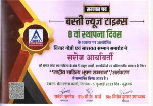 आर्यावर्ती सरोज “आर्या ” को बस्ती न्यूज टाइम्स के आठवें स्थापना दिवस पर विचार गोष्ठी एवं सारस्वत सम्मान समारोह में समाज सेवा और साहित्य के क्षेत्र में उत्कृष्ट , कार्य उपलब्धियों एवं अविस्मरणीय योगदान के लिए “राष्ट्रीय साहित्य भूषण सम्मान” अलंकरण से सम्मानित किया गया।