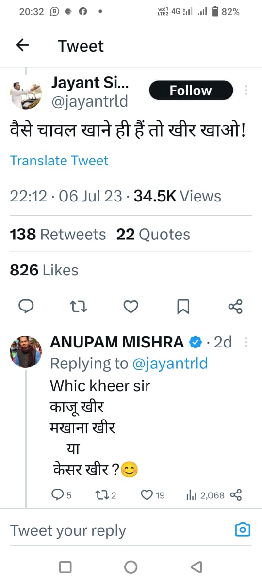 सूत्रों का दावा इसलिए भी मजबूत कहा जा रहा है, क्योंकि हाल ही में राहुल गांधी के धान बुआई के फोटो के बाद आए जयंत चौधरी के ट्वीट में कहा गया है कि “अगर चावल ही खाने हैं तो खीर खाओ ” इस ट्वीट के मायने में खीर “भाजपा” को ही समझा जा रहा है।
