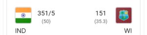 भारत और वेस्टइंडीज के बीच ODI सीरीज का तीसरा और निर्णायक मुकाबला आज रात टीम इंडिया ने 200 रन से अपने नाम किया। इसके साथ ही भारत ने सीरीज भी 2-1 से जीत ली। वेस्टइंडीज ने टॉस जीतकर पहले गेंदबाजी करने का फैसला किया और भारत ने पहले बल्लेबाजी करते हुए पांच विकेट पर 351 रन बनाए। इसके जवाब में वेस्टइंडीज की टीम 151 रन ही बना सकी और मैच 200 रन से हार गई ।भारत ने वेस्टइंडीज को 200 रन से हराकर सीरीज भी अपने नाम कर ली है। शार्दुल ठाकुर ने जायडेन सेल्स को एक रन के स्कोर पर आउट कर वेस्टइंडीज की पारी खत्म की। वेस्टइंडीज की टीम 352 रन का पीछा करते हुए सिर्फ 151 रन ही बना सकी और 200 रन से मैच हार गई। इस सीरीज का पहला मैच भारत ने पांच विकेट से जीता था। वहीं, वेस्टइंडीज ने दूसरा मैच छह विकेट से जीतकर बराबरी की। भारत ने तीसरा मैच 200 रन से जीता और सीरीज अपने नाम की। इस मैच में भारत ने टॉस हारकर पहले बल्लेबाजी करते हुए पांच विकेट पर 351 रन बनाए। शुभमन गिल ने 85 और ईशान किशन ने 77 रन बनाए। कप्तान हार्दिक ने नाबाद 70 और संजू सैमसन ने 51 रन की पारी खेली। वेस्टइंडीज के लिए रोमारियो शेफर्ड ने दो विकेट लिए। इसके जवाब में वेस्टइंडीज की टीम सिर्फ 151 रन ही बना सकी। सबसे ज्यादा नाबाद 39 रन गुदाकेश मोती ने बनाए। वेस्टइंडीज के सात बल्लेबाज दहाई का आंकड़ा पार नहीं कर पाए। भारत के लिए शार्दुल ठाकुर ने चार और मुकेश कुमार ने तीन विकेट लिए। कुलदीप यादव को दो और जयदेव उनादकट को एक विकेट मिला। अब दोनों टीमों के बीच पांच T20 मैचों की सीरीज खेली जाएगी▪️