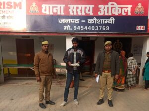 कौशाम्बी। अपराध एवं अपराधियो के विरूद्ध चलाये जा रहे अभियान के क्रम में थाना सराय अकिल पुलिस उ0नि0 संजय सिंह परिहार मय हमराह पुलिस बल द्वारा मु0अ0सं0 422/23 धारा 376/377/504/506/507 भादवि से सम्बन्धित वांछित अभियुक्त करदम सिंह पुत्र शिव प्रसाद सिंह नि० ग्राम सोनारी थाना धाता जनपद फतेहपुर द्वारा वादिनी के साथ पुनः गाली गलौज मारपीट व मारने की नीयत से कट्टा लहराने पर अभियुक्त को जुगराजपुर गांव के पास से गिरफ्तार किया गया तथा अभियुक्त के कब्जे से 01 अदद तमंचा 315 बोर व 05 अदद जिन्दा कारतूस 315 बोर बरामद किया गया। जिसके सम्बन्ध में थाना स्थानीय पर मु0अ0सं0 520/23 धारा 323/504/506 भादवि व 3/25 आर्म्स एक्ट पंजीकृत किया गया । विधिक कार्यवाही के पश्चात अभियुक्त को मा0 न्यायालय भेजा जा रहा है।