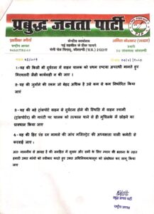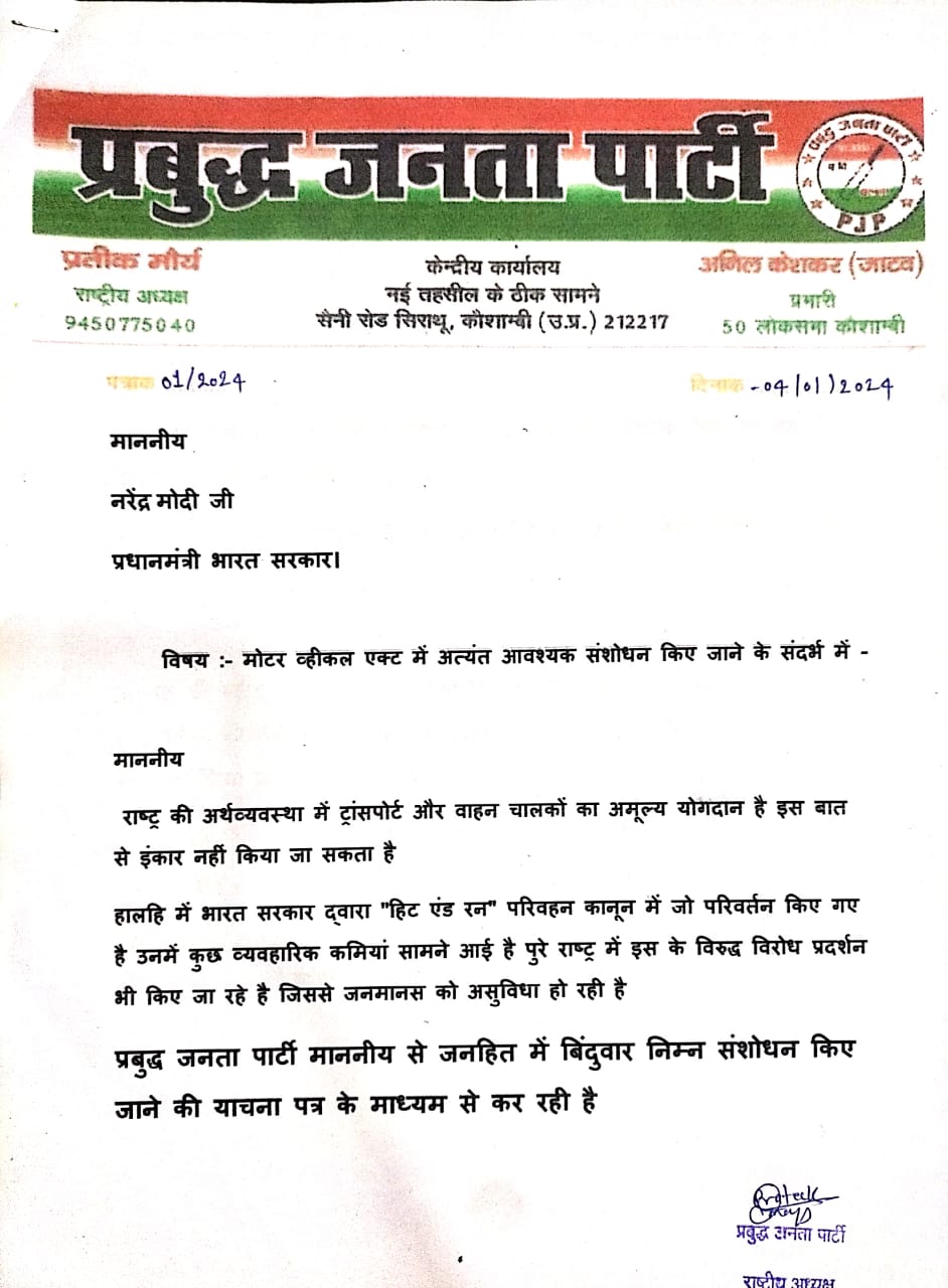 प्रबुद्ध जनता पार्टी ने मोटर व्हीकल एक्ट में बदलाव के लिए प्रधानमंत्री नरेंद्र मोदी को भेजा पत्र