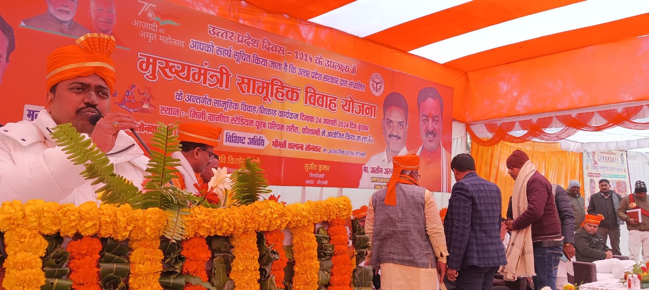 सासंद विनोद सोनकर ने समारोह को सम्बोधित करते हुए मुख्यमंत्री सामूहिक विवाह कार्यक्रम इतने भव्य एवं व्यवस्थित तरीके से आयोजित कराने के लिए जिला प्रशासन को धन्यवाद दिया। उन्होंने नव-विवाहित जोड़ों को आर्शीवाद देते हुए ईश्वर से सफल एवं सुखमय वैवाहिक जीवन की कामना की एवं सभी को उ0प्र0 दिवस की हार्दिक शुभकॉमनायें दी। उन्हांने अर्ह युवाओं से कहा कि जिनका नाम मतदाता सूची में दर्ज नहीं हैं, वे अपना नाम मतदाता सूची में अवश्य दर्ज करायें तथा राष्ट्र निर्माण में अपना योगदान करें। उन्हांने कहा कि केन्द्र एवं प्रदेश में ऐसी सरकार है, जो बिना किसी भेद-भाव के गरीब, शोषित, पीड़ित, मजदूर, किसान एवं समाज के सभी वर्गों की चिन्ता कर, उनके कल्याण के लिए निरन्तर कार्य कर रहीं है। मुख्यमंत्री की मंशा के अनुरूप मुख्यमंत्री सामूहिक विवाह योजना के तहत गरीब बेटियों का विवाह कराया जा रहा हैं। उन्होंने कहा कि मुख्यमंत्री के नेतृत्व में गरीब बेटियॉ, जो कभी सपना नहीं देख सकतीं, कल्पना भी नहीं कर सकतीं थी, कि उनका भी इतने भव्य तरीके से विवाह होगा, जिसमें सांसद एवं जिलाधिकारी आदि शामिल होंगे, मुख्यमंत्री सामूहिक विवाह योजना के तहत गरीब बेटियों के विवाह करायें जा रहें हैं। प्रधानमंत्री ने 2014 में हरियाणा की धरती से देश के लोगों से आवाह्न कर संकल्प दिलाया कि इस देश की बेटी को बचाना भी है तथा पढ़ाना भी है। प्रधानमंत्री के नेतृत्व में देश की बेटियों को बचाने के साथ ही पढ़ाने एवं आगे बढ़ाने का कार्य हुआ है। बेटी के पैदा होने से लेकर शिक्षा, रोजगार एवं विवाह की व्यवस्था सरकार द्वारा की जा रहीं है। उन्होंने कहा कि बेटियों के पैदा होने पर मुख्यमंत्री कन्या सुमंगला योजना के तहत रू0-06 हजार खाते में जमा कराया जाता है। उन्हांने कहा कि प्रधानमंत्री के नेतृत्व में देश नया इतिहास रच रहा है। उन्होंने कहा कि सामूहिक विवाह कार्यक्रम का आयोजन जिला मुख्यालय के स्थान पर विधानसभावार आयोजित किया जा रहा हैं ताकि गॉव के लोंगो को आने-जाने में कोई परेशानी न होने पायें। 29 जनवरी को चायल विधानसभा के नेवादा में सामूहिक विवाह का आयोजन किया जायेंगा। उन्होंने कहा कि जनपद कौशाम्बी के एक-एक मजरे का विद्युतीकरण करने का कार्य किया गया है। जनपद में मेडिकल कॉलेज निर्माणाधीन हैं। बसडिपो मंझनपुर का निर्माण कार्य हुआ है। उन्होंने कहा कि दंगल मैदान पश्चिम शरीरा के बाउण्ड्रीवाल का टेण्डर हो गया है, 40 लाख की लागत से बाउण्ड्रीवाल का कार्य कराया जायेंगा, किसी भी व्यापारी की कोई दुकान उजाड़ी नहीं जायेंगी।