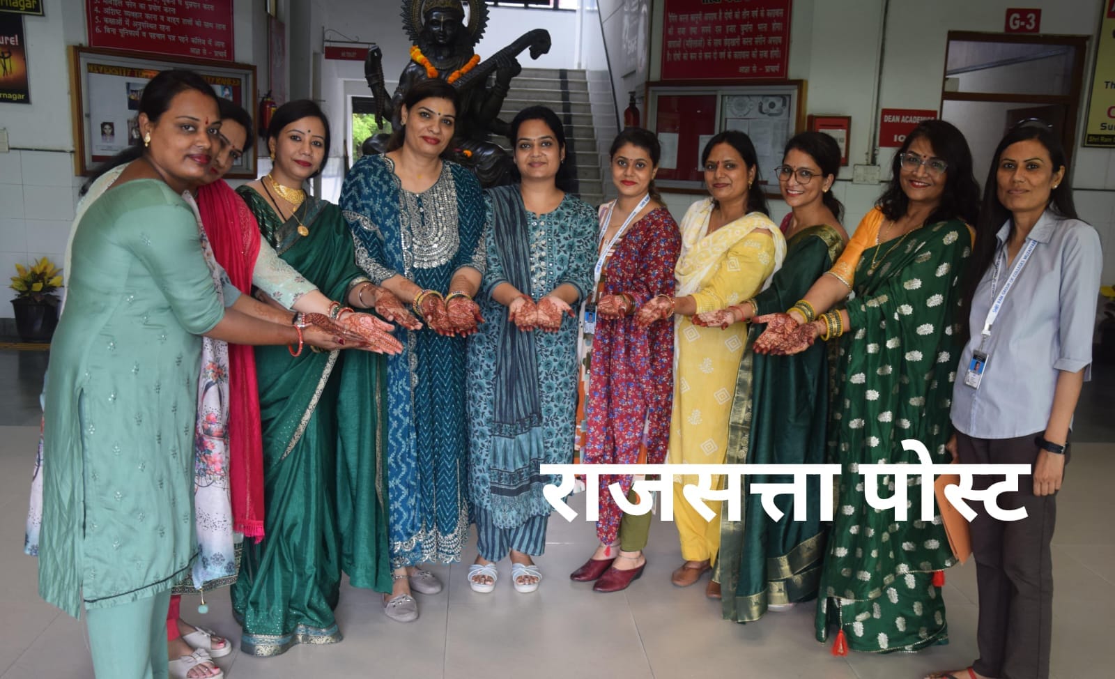 मुज़फ्फरनगर,श्रीराम कॉलेज में आज हरियाली तीज महोत्सव बडी धूमधाम के साथ मनाया गया। इस अवसर पर संस्थान मे मेहंदी प्रतियोगिता का आयोजन किया गया। जिसमें सभी शिक्षिकाओं ने बढ़चढ़ कर प्रतिभाग लिया। बेसिक साइंस विभाग की विभागाध्यक्षा डा0 पूजा तोमर ने कार्यक्रम की मुख्य अतिथि एवं निर्णायक डा0 प्रेरणा मित्तल, प्राचार्या श्रीराम कॉलेज एवं नीतू सिंह, एडमिशन कण्ट्रोलर, एसआरजीसी तथा डा0 सुचित्रा त्यागी, डीन श्रीराम कॉलेज आफ इंजीनियरिंग का स्वागत किया।