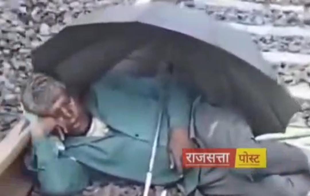 रेलवे पटरी पर छाता लेकर सोया अधेड़