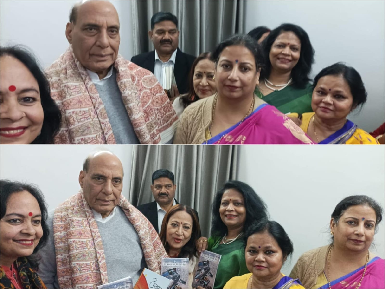 श्री राजनाथ सिंह ने सभी सदस्यों से बहुत ही सौहार्दपूर्ण ढंग से बातचीत की और उनके कुशलक्षेम की जानकारी ली। उन्होंने शिष्टमंडल के प्रत्येक सदस्य की भूमिका और उनके योगदान की प्रशंसा की। मंत्री महोदय ने अंतरराष्ट्रीय कवयित्री श्रीमती नीरजा शुक्ला से कनाडा की वर्तमान राजनीतिक स्थिति पर चर्चा करते हुए उनके अनुभवों को सुना। उन्होंने पुस्तक में शामिल लेखकों और कवियों के प्रयासों को सराहा और समूह की इस अद्भुत पहल के लिए हार्दिक शुभकामनाएँ दीं।