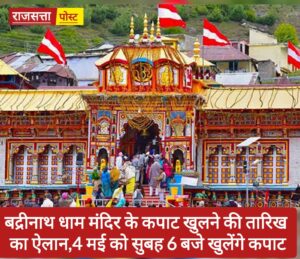 विश्व प्रसिद्ध श्री बदरीनाथ धाम के कपाट 4 मई को सुबह 6 बजे खुलेंगे. टिहरी राजदरबार के महाराजा मनुजेंद्र शाह ने इसकी जानकारी मीडिया को दी.