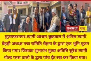 मुज़फ्फरनगर:सहकारी गन्ना समिति रोहना के अध्यक्ष अनिल त्यागी बहेडी ने बसंत पंचमी के अवसर पर शुक्रताल में शुकदेव जी के मंदिर में दर्शन करने के उपरान्त त्यागी आश्रम शुक्रताल में अपने बेटे अनुभव की स्मृति में नए कमरे के लिए पूजन कराकर शुभारम्भ किया जिसमें मुख्य अतिथि सुरेश त्यागी एमडी गोल्ड प्लस ग्लास,नवीन त्यागी जी अध्यक्ष त्यागी आश्रम,संजीव त्यागी पूरा, अरुण त्यागी सदस्य जिला पंचायत,अनिरुद्ध त्यागी,नवीन त्यागी रुड़की,विनोद त्यागी, अशोक त्यागी, हरीश त्यागी एवं गणमान्य व्यक्तियों के द्वारा आश्रम के सुधार एवं सौंदर्य कर्ण एवं राम रसोई के लिए विचार विमर्श किया गया।।