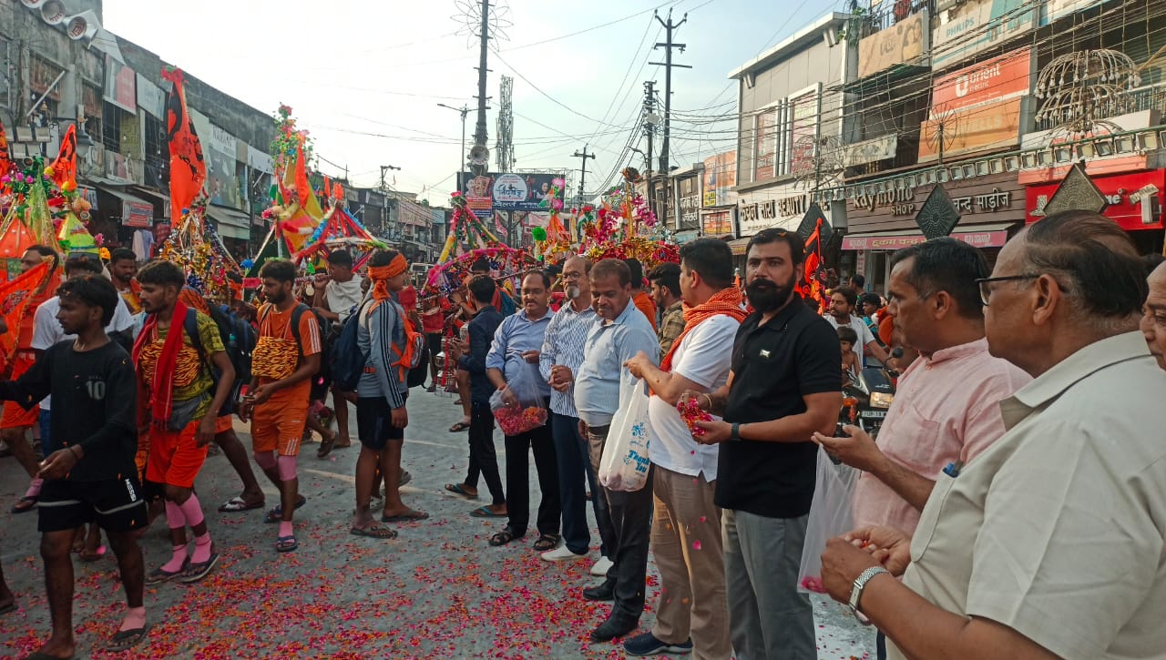 शिव चौक पर दवा व्यापारियों ने कांवड़ियों पर की पुष्पवर्षा