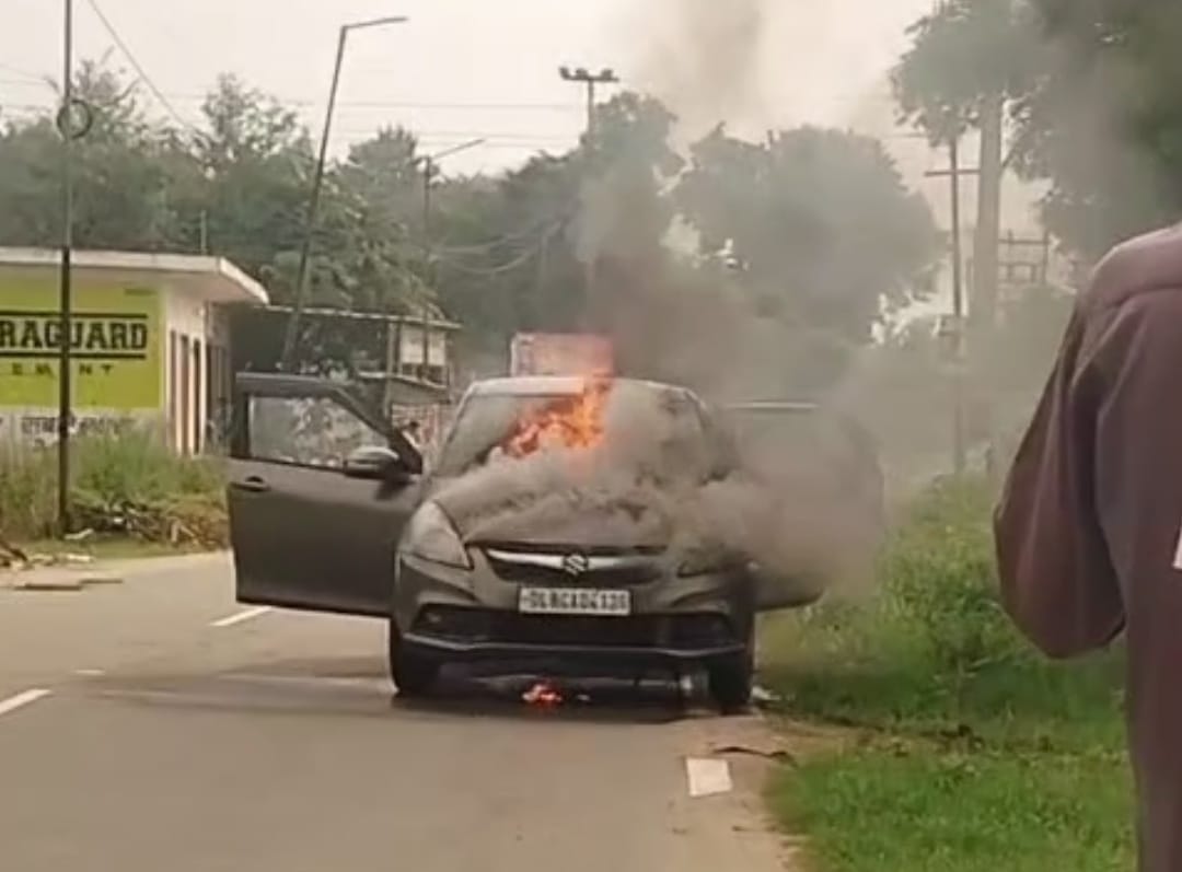 कार में आग लगने से हड़कंप,कार सवारों ने कूदकर बचाई जान।