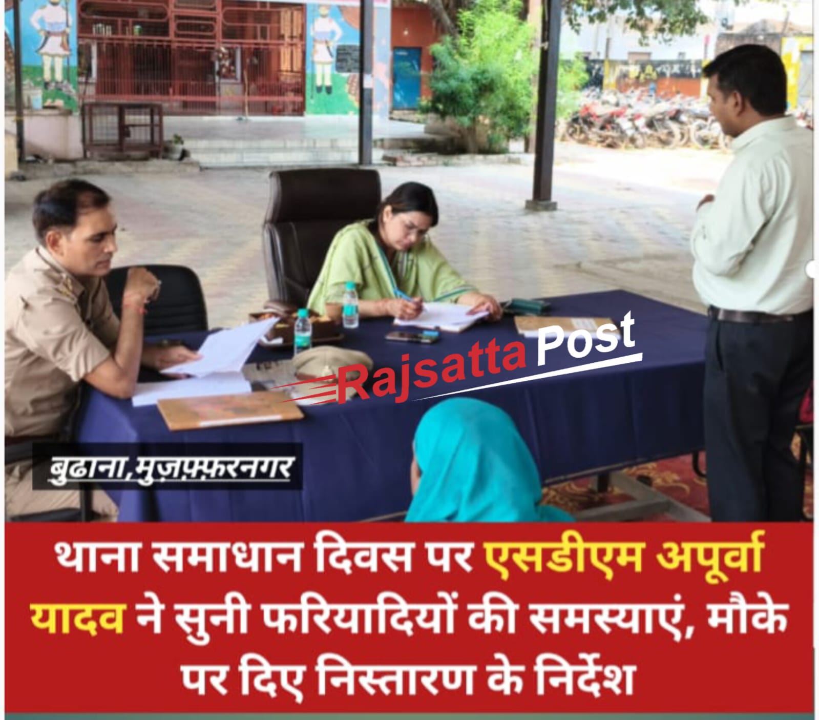 जनपद मुजफ्फरनगर के बुढ़ाना थाना परिसर में आज थाना समाधान दिवस का आयोजन किया गया, जिसमें एसडीएम बुढ़ाना अपूर्वा यादव ने स्वयं उपस्थित रहकर जनता की समस्याओं को सुना। इस दौरान उन्होंने फरियादियों की शिकायतों को गंभीरता से लेते हुए संबंधित विभागों के अधिकारियों को मौके पर ही आवश्यक दिशा-निर्देश दिए।