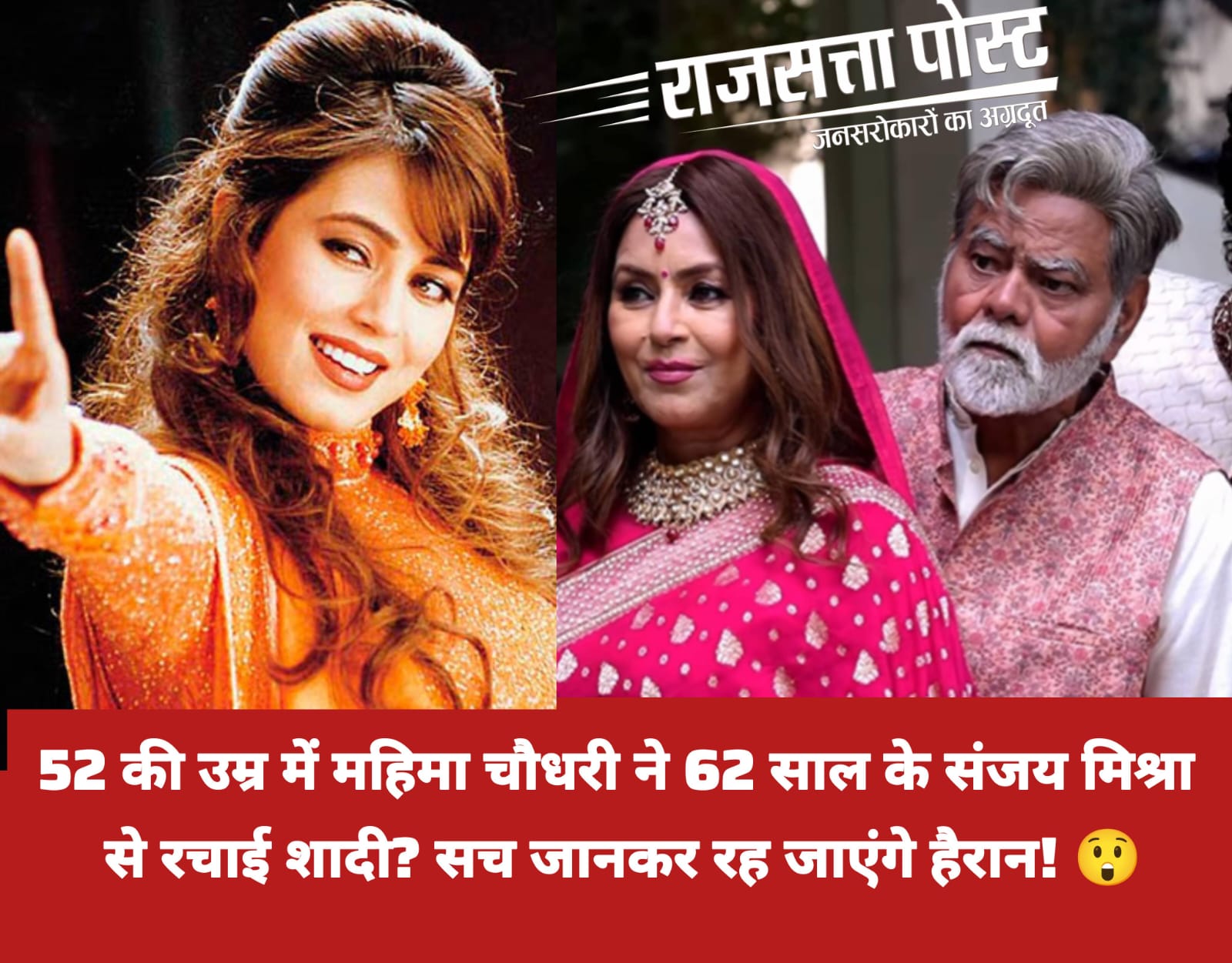 मुम्बई।बॉलीवुड में हलचल मच गई जब खबर आई कि एक्ट्रेस महिमा चौधरी ने 62 वर्षीय एक्टर संजय मिश्रा से दूसरी शादी कर ली है। वायरल तस्वीरों और वीडियोज़ में दोनों शादी के जोड़े में नज़र आए — महिमा दुल्हन के लिबास में और संजय मिश्रा दूल्हे के रूप में।