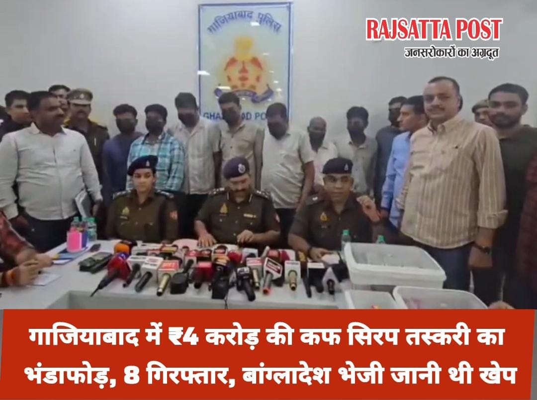 गाजियाबाद क्राइम ब्रांच ने चार ट्रकों में छिपाकर भेजी जा रही ~₹4 करोड़ की अवैध कफ सिरप की खेप जब्त, 8 तस्कर गिरफ्तार — खेप यूपी-दिल्ली होते हुए बांग्लादेश भेजी जा रही थी