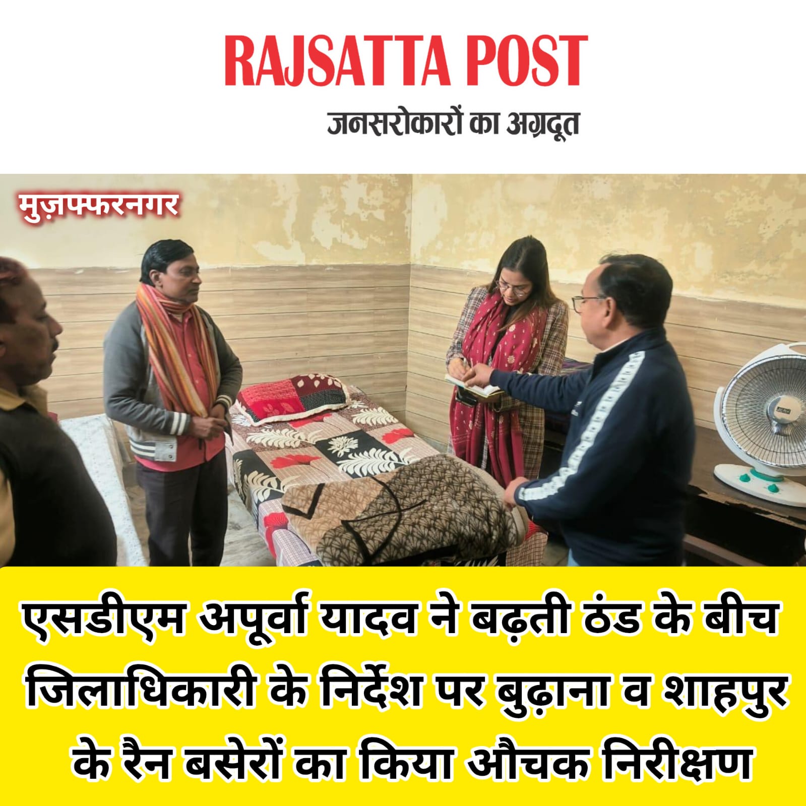 जनपद में लगातार बढ़ रही ठंड और कोहरे को देखते हुए जिलाधिकारी उमेश मिश्रा के निर्देश पर बुढ़ाना तहसील क्षेत्र में प्रशासन पूरी तरह सतर्क नजर आया। इसी क्रम में बुढ़ाना की एसडीएम अपूर्वा यादव ने नगर पंचायत क्षेत्र में बने रैन बसेरों का औचक निरीक्षण किया। साथ ही बुढ़ाना एवं शाहपुर क्षेत्र में संचालित रैन बसेरों का भी निरीक्षण कर वहां की व्यवस्थाओं का जायजा लिया गया।