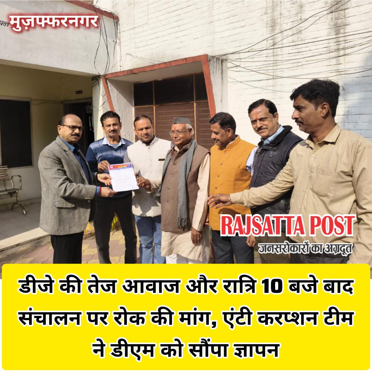 मुज़फ्फरनगर। ऑल इंडिया एंटी करप्शन सर्विस ट्रस्ट की टीम ने जिले में डीजे की अत्यधिक तेज आवाज पर नियंत्रण और रात्रि 10:00 बजे के बाद डीजे बजाने पर रोक लगाने की मांग को लेकर जिलाधिकारी उमेश मिश्रा को ज्ञापन सौंपा।