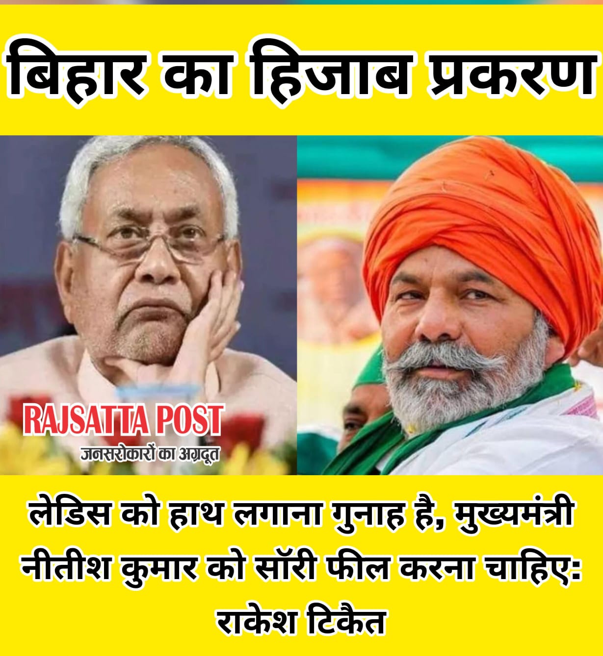 मुज़फ्फरनगर। बिहार के मुख्यमंत्री नीतीश कुमार द्वारा एक कार्यक्रम के दौरान एक मुस्लिम महिला डॉक्टर का हिजाब हटाकर फोटो खिंचवाने के मामले ने सियासी तूल पकड़ लिया है। इस घटना को लेकर जहां देशभर में विवाद और आलोचना हो रही है, वहीं अब किसान नेता राकेश टिकैत का भी कड़ा बयान सामने आया है।