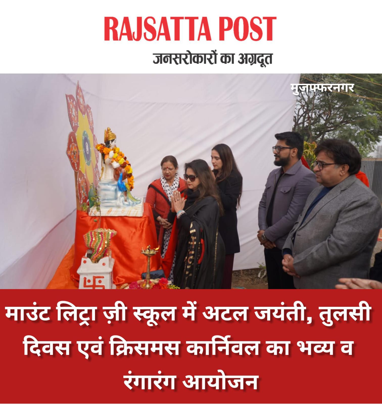 माउंट लिट्रा ज़ी स्कूल में दिनांक 25 दिसंबर 2025 को पूर्व प्रधानमंत्री भारत रत्न स्वर्गीय अटल बिहारी वाजपेयी की जयंती, तुलसी दिवस एवं क्रिसमस कार्निवल का भव्य आयोजन हर्षोल्लास एवं उल्लासपूर्ण वातावरण में संपन्न हुआ। यह आयोजन बच्चों, अभिभावकों एवं नगरवासियों के लिए मनोरंजन, रचनात्मकता और सामाजिक चेतना से भरपूर एक यादगार अनुभव रहा।