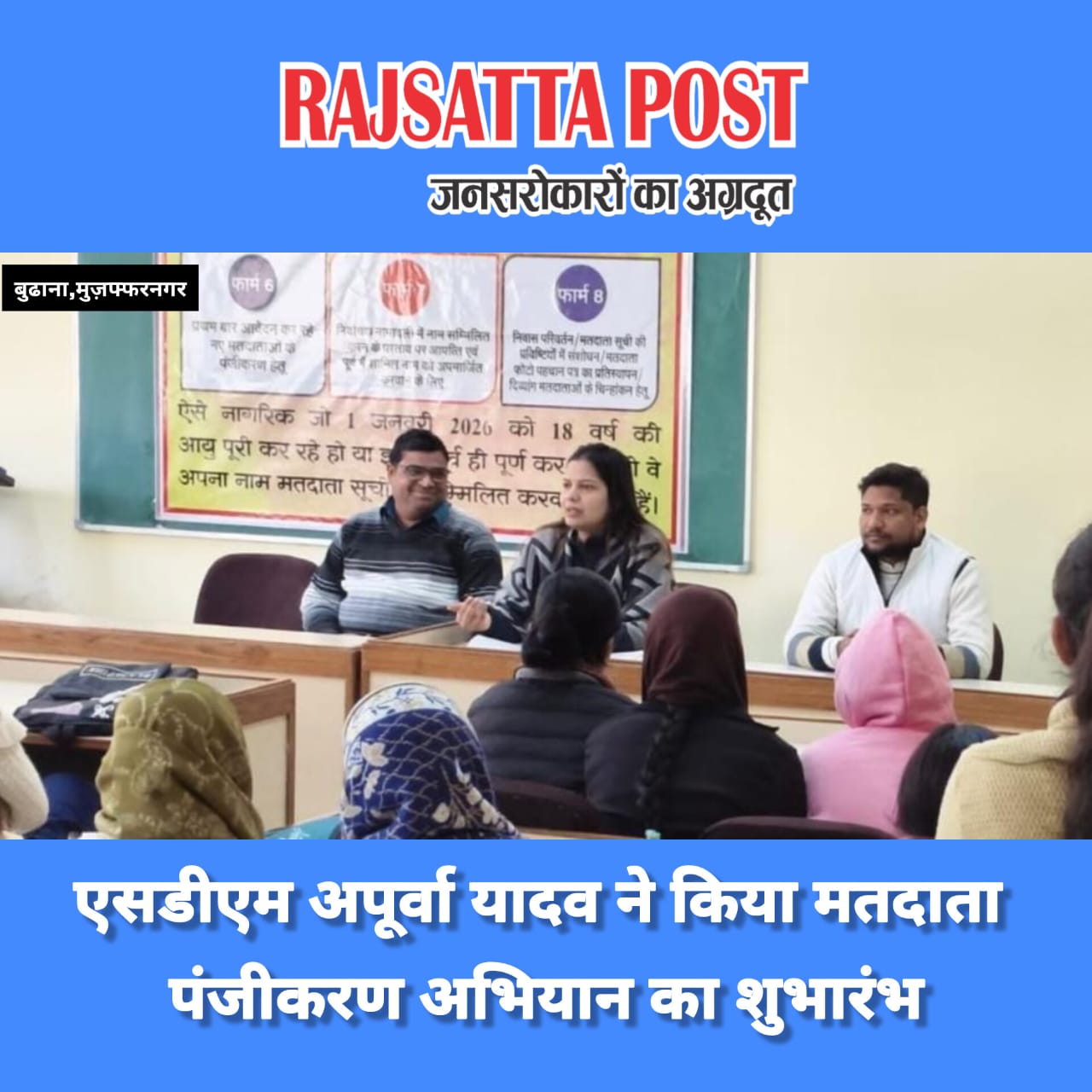 मुजफ्फरनगर। तहसील बुढ़ाना क्षेत्र की विधानसभा बुढ़ाना में एसडीएम बुढ़ाना अपूर्वा यादव द्वारा राजकीय महाविद्यालय शाहपुर में मतदाता पंजीकरण कार्यक्रम का शुभारंभ किया गया। कार्यक्रम के दौरान नए मतदाताओं को जोड़ने की प्रक्रिया और पात्रता से संबंधित विस्तृत जानकारी दी गई।