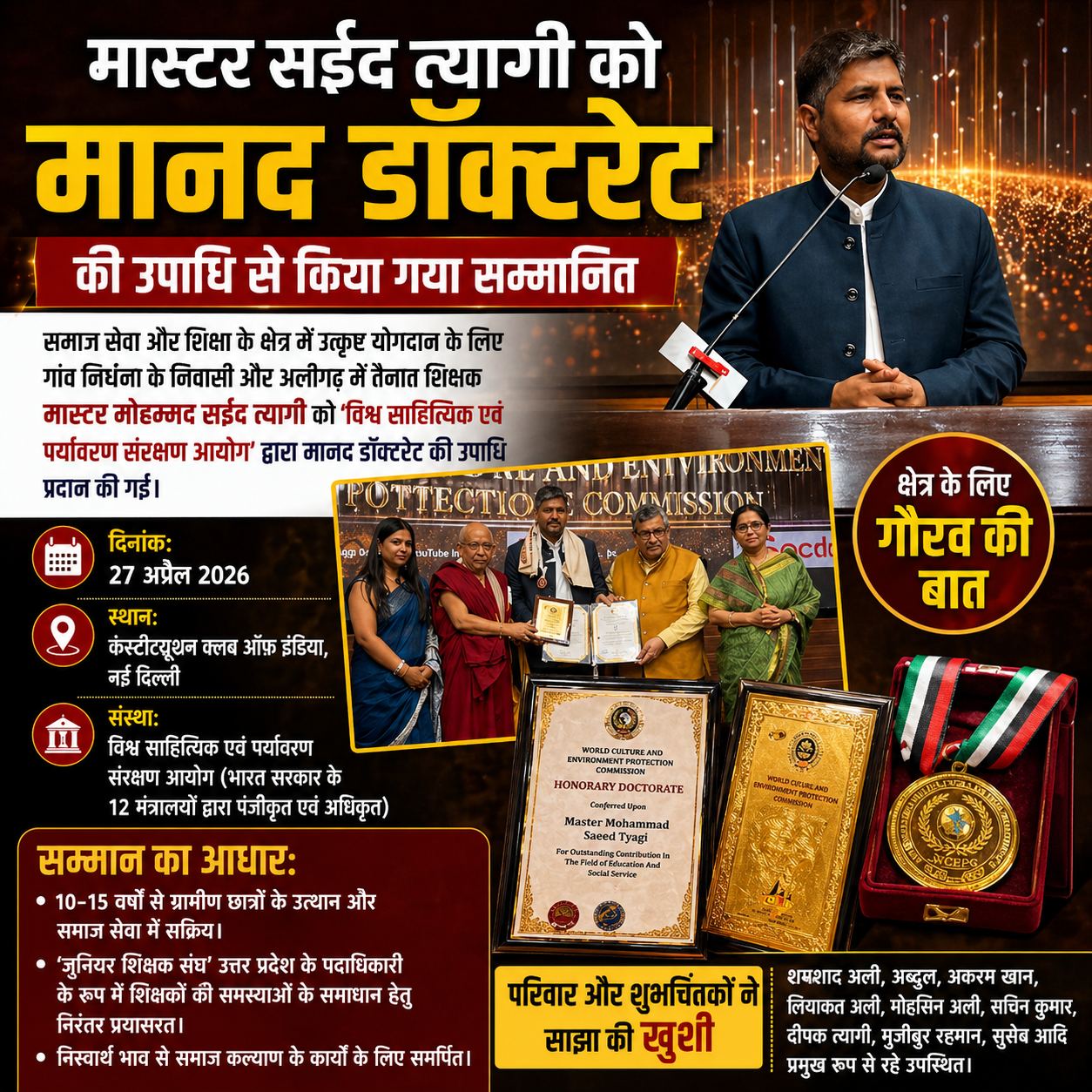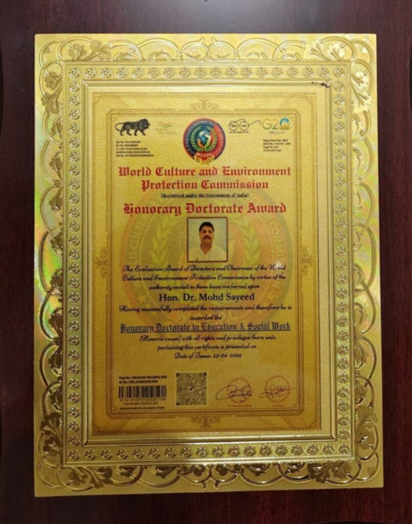नई दिल्ली। समाज सेवा और शिक्षा के क्षेत्र में उल्लेखनीय योगदान देने वाले मुज़फ्फरनगर जनपद के विकास खंड चरथावल क्षेत्र के गांव निर्धना निवासी एवं अलीगढ़ में तैनात शिक्षक मास्टर मोहम्मद सईद त्यागी को ‘विश्व साहित्यिक एवं पर्यावरण संरक्षण आयोग’ द्वारा मानद डॉक्टरेट की उपाधि से सम्मानित किया गया। यह सम्मान 27 अप्रैल 2026 को नई दिल्ली स्थित कंस्टीट्यूशन क्लब ऑफ इंडिया में आयोजित एक भव्य समारोह के दौरान प्रदान किया गया।
