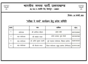 देहरादून।छात्रों में परीक्षा का तनाव दूर करने के लिए प्रधानमंत्री नरेंद्र मोदी के परीक्षा पे चर्चा कार्यक्रम के सफल क्रियान्वयन के लिए भाजपा के राष्ट्रीय अध्यक्ष जेपी नड्डा के निर्देश पर राज्य स्तरीय प्रदेश समिति का गठन किया है जिसमें भाजपा प्रदेश मंत्री आदित्य चोहान को प्रदेश संयोजक, डा प्रदीप त्यागी रुड़की, भाजयुमो प्रदेश अध्यक्ष शशांक रावत व कैलाश भगत नैनीताल को प्रदेश सहसंयोजक बनाया गया हैं।