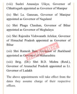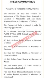 राष्ट्रपति ने महाराष्ट्र के राज्यपाल भगत सिंह कोश्यारी और लद्दाख के उपराज्यपाल राधा कृष्णन माथुर का इस्तीफा किया स्वीकार