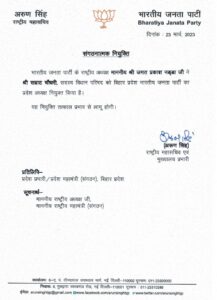 भारतीय जनता पार्टी के राष्ट्रीय महासचिव एवं मुख्यालय प्रभारी अरुण सिंह ने प्रदेश अध्यक्षों के नामों का पत्र जारी किया है।